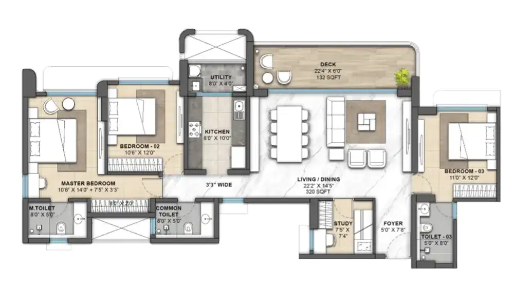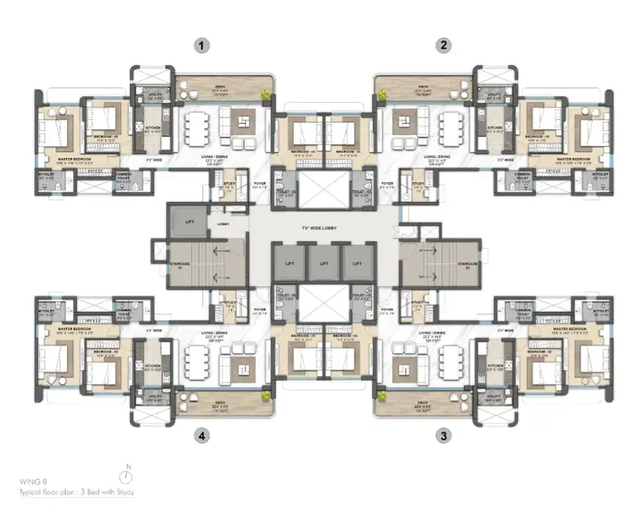 Floor plans at Lodha Elanor Camp Road have been meticulously created to enhance every square foot-ensuring privacy, comfort, and open space across all 3BHK and 3BHK + study configurations.